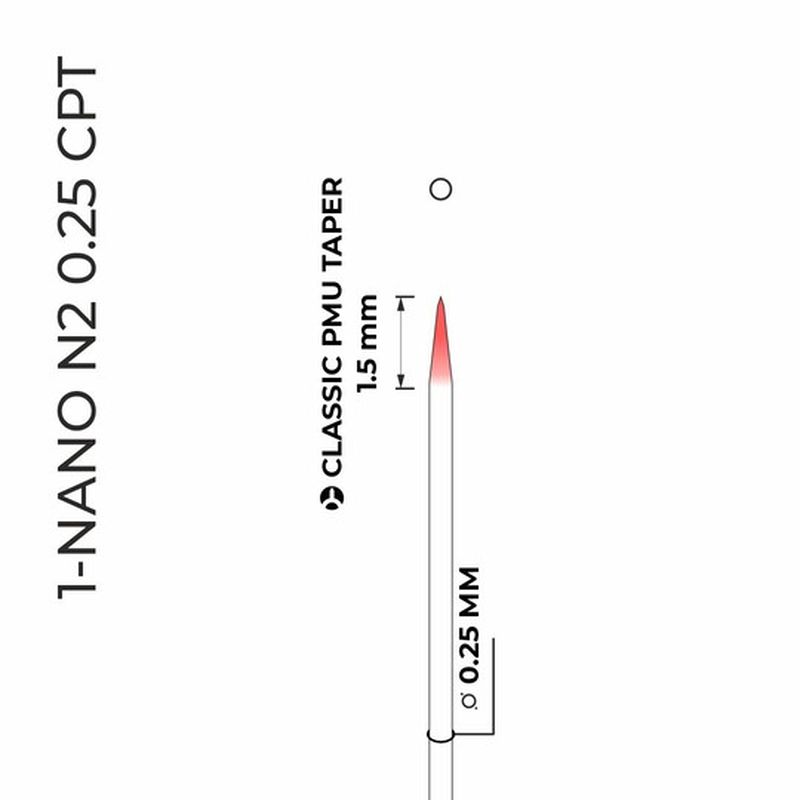 Our 1-NANO N2 CPT is our all-time all-rounder and bestseller needle. It features a classic PMU taper, specially designed to perform all PMU techniques regardless of the face or body zone. We improved the skin penetration and the membrane tension so the needle travel quicker into and out of the skin instantly but ensuring a good depth control simultaneously. The new 1-NANO N2 0.25 CPT has the widest nose in our round liners range. This feature combined with the enhanced skin penetration is ideal for defined contours, hairstrokes full of colors or full shading techniques. Bringing a big benefit to clients with sensitive or thin skin. Less trauma is caused, and therefore less color is pushed out of the skin by the lymphatic system.